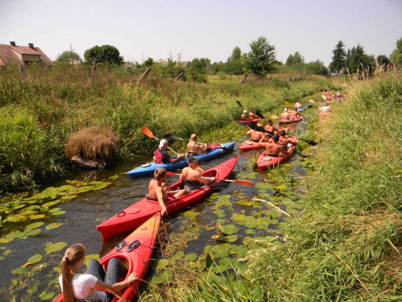Kolejny postój możemy zaplanować po dwóch godzinach. Zanim do niego docieramy musimy przepłynąć leżąc w kajaku pod dużym przywalonym przez rzekę drzewem. Na całej trasie spływu widać prace bobrów. Takie przeszkody dodają smaczku wyprawie. Po pokonaniu tej przeszkody, w miejscu dawnej tamy, robimy przerwę na posiłek. W kajakach sporo ziela. Wiosłowanie po Zielawie w początkowej części spływu to walka o to, aby w ogóle się poruszać.