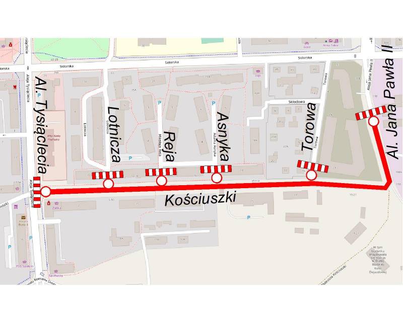 Polegają na wyłączeniu z ruchu ulicy Kościuszki na odcinku od skrzyżowania z al. Tysiąclecia do al. Jana Pawła oraz częściowo al. Jana Pawła II (zgodnie ze schematem). Autobusy komunikacji miejskiej poruszają się ul. Sidorską. Za utrudnienia przepraszamy.