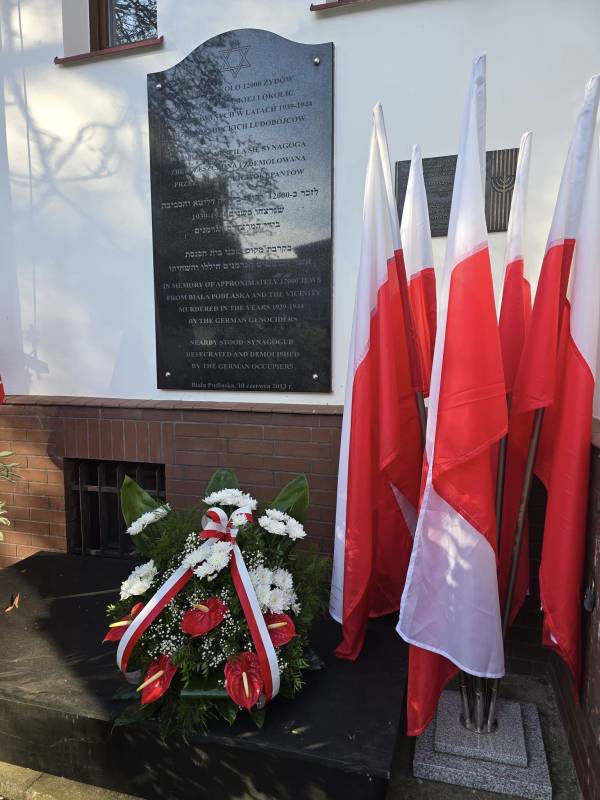 W 82. rocznicę likwidacji getta w Białej Podlaskiej wiceprezydent Justyna Gorczyca, dyrektor Gabinetu Prezydenta Wojciech Sosnowski, naczelnik Wydziału Edukacji i Spraw Społecznych dr Stanisław Romanowski oraz Beata Demianiuk, naczelnik Wydziału Kultury, Sportu i Współpracy z Organizacjami Pozarządowymi w asyście Straży Miejskiej złożyli kwiaty w miejscach upamiętniających żydowskich mieszkańców naszego miasta.