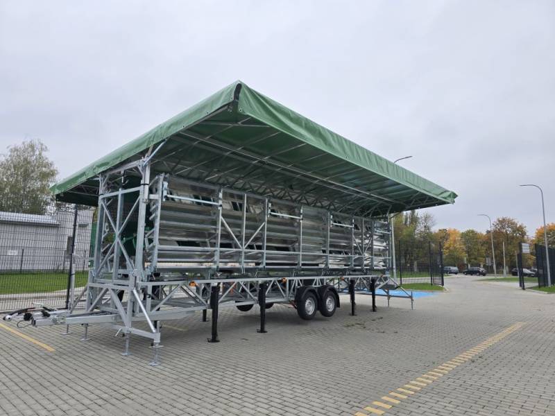 Wyposażenie trybuny mobilnej to również: barierki ochronne z trzech stron oraz wsporniki dachu i balasty wodne, siatka na tył, boki i osłonę dolnej części, jak również niezbędne akcesoria, m.in. koło zapasowe, trójkąt ostrzegawczy, skrzynka narzędziowa.