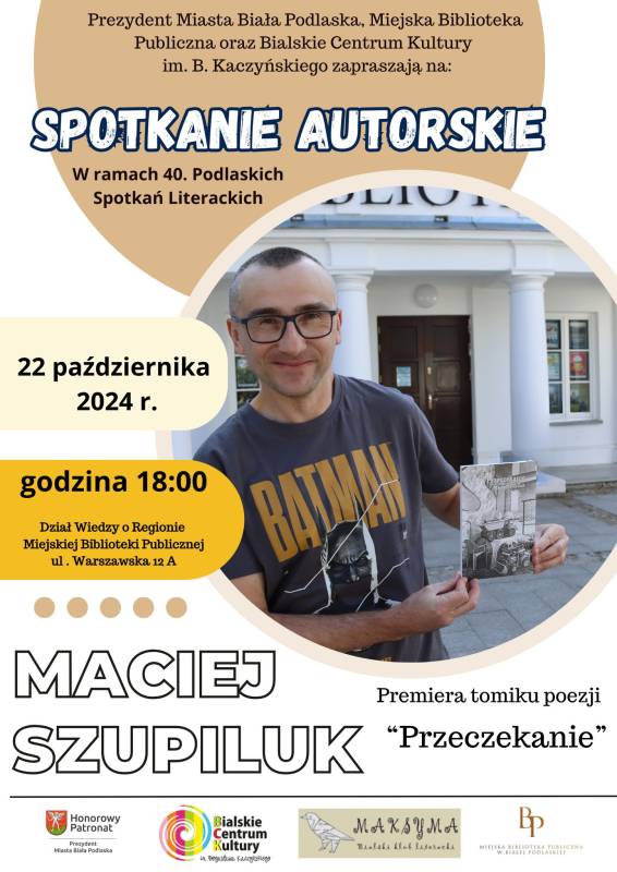 "Przeczekanie" to tytuł najnowszego tomiku poezji Macieja Szupiluka, Prezesa Bialskiego Klubu Literackiego "Maksyma", z którym będziemy mogli spotkać się już 22 października o godzinie 18:00 w Dziale Wiedzy o Regionie Miejskiej Biblioteki Publicznej Białej Podlaskiej.