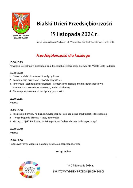 W Białej Podlaskiej staramy się promować i wspierać przedsiębiorczość wśród mieszkańców, a przede wszystkim wśród bialskiej młodzieży. Bialski Dzień Przedsiębiorczości w Urzędzie Miasta Biała Podlaska to wydarzenie, które odbywa się w ramach Światowego Tygodnia Przedsiębiorczości 19 listopada 2024 r. w sali 238 (II piętro).