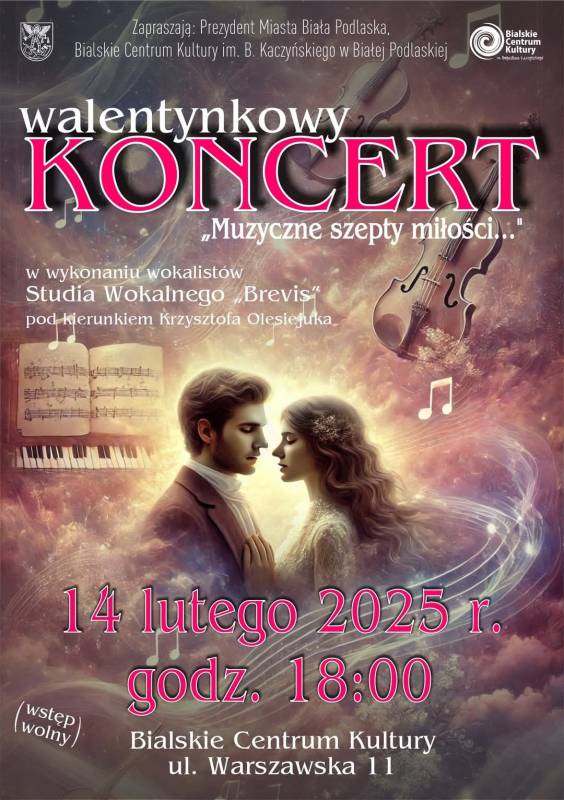 Walentynkowy koncert pt. "Muzyczne szepty miłości..." w wykonaniu wokalistów Studio Wokalnego "Brevis" pod kierownictwem maestro Krzysztofa Olesiejuka odędzie się 14 lutego o godzinie 18:00 w Bialskim Centrum Kultury przy ul. Warszawskiej 11.