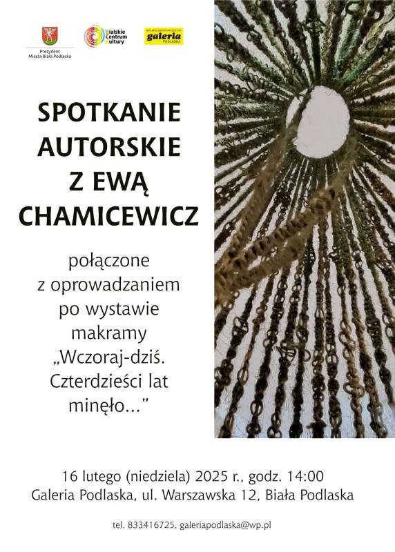 W niedzielę, 16 lutego 2025 r. o godz. 14.00 odbędzie się spotkanie z Ewą Chamicewicz, autorką obecnie trwającej wystawy makramy "Wczoraj - dziś. Czterdzieści lat minęło..."