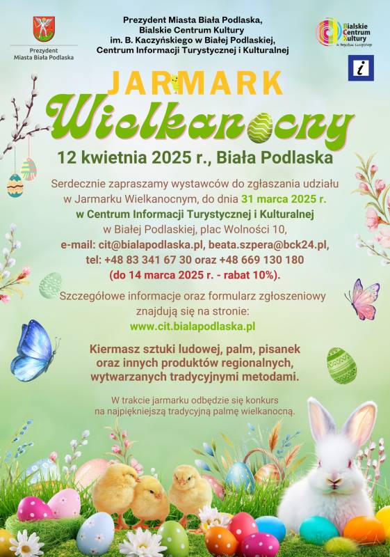 Serdecznie zapraszamy wystawców do zgłaszania udziału w Jarmarku Wielkanocnym do 31 marca 2025 r. do Informacji Turystycznej w Białej Podlaskiej (plac Wolności 10), e-mail: cit@bialapodlaska.pl, tel. +48 83 341 67 30 oraz +48 669 113 180.