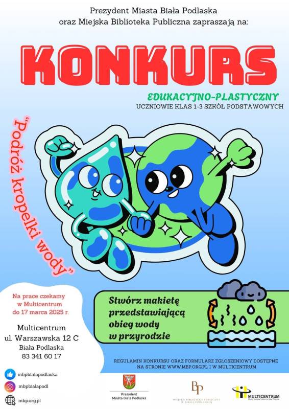 Zadaniem uczestników jest stworzenie makiety przedstawiającej podróż kropelki wody przez różne etapy jej cyklu – od opadu deszczu, przez wsiąkanie w ziemię, parowanie, skraplanie itd. Do wykonania makiety można użyć dowolnej techniki plastycznej. Konkurs kierowany jest do uczniów z klas 1- 3 szkół podstawowych. Na prace konkursowe organizatorzy czekają do poniedziałku 17 marca br. Regulamin konkursu oraz kartę zgłoszeniową znajdziecie na stronie internetowej: tutaj