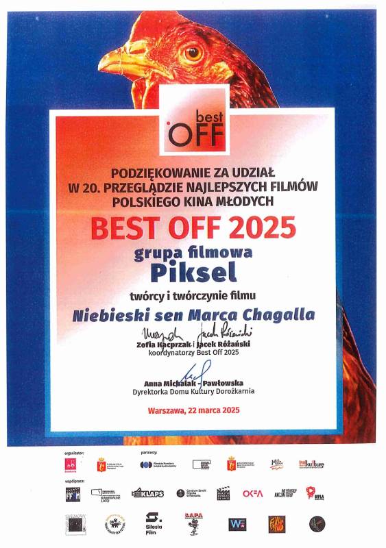 Animacja „Niebieski sen Marca Chagalla" autorstwa 21 wychowanków Pracowni Grafiki Komputerowej „Piksel" z naszego Bialskiego Centrum Kultury została zakwalifikowana do 20. Ogólnopolskiego Przeglądu Najlepszych Filmów Polskiego Kina Młodych BEST OFF 2025!