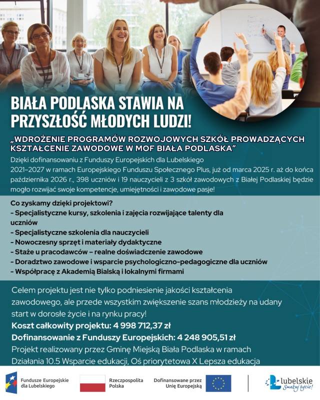 Dzięki dofinansowaniu z Funduszy Europejskich dla Lubelskiego 2021–2027 w ramach Europejskiego Funduszu Społecznego Plus, już od marca 2025 r. aż do końca października 2026 r., 398 uczniów i 19 nauczycieli z 3 szkół zawodowych z Białej Podlaskiej będzie mogło rozwijać swoje kompetencje, umiejętności i zawodowe pasje!