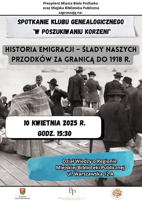 Klub genealogiczny "W poszukiwaniu korzeni" działający w Miejskiej Bibliotece Publicznej w Białej Podlaskiej zaprasza na kolejne spotkanie. Wydarzenie odbędzie się 10 kwietnia o godzinie 15:30 w Dziale Wiedzy o Regionie Miejskiej Biblioteki Publicznej. Tematem spotkania będzie "Historia emigracji - ślady naszych przodków za granicą do 1918 r."