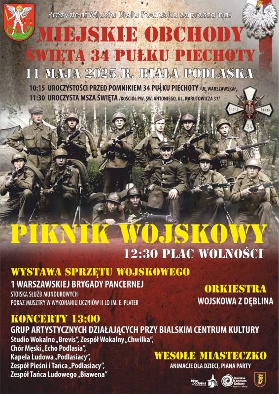 Miejskie obchody Święta 34 Pułku Piechoty odbędą się 11 maja, a rozpoczną się o godz.10:15 spotkaniem przed pomnikiem 34 PP przy ul. Warszawskiej.