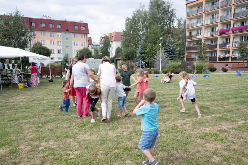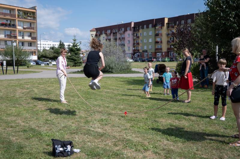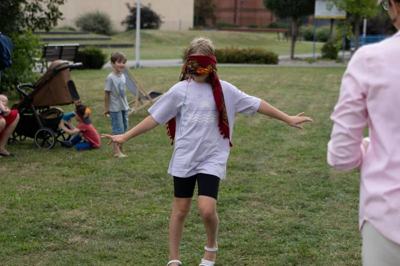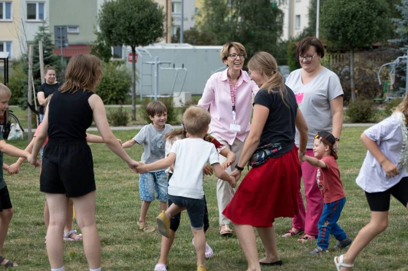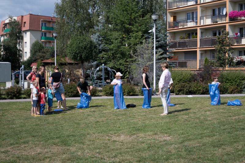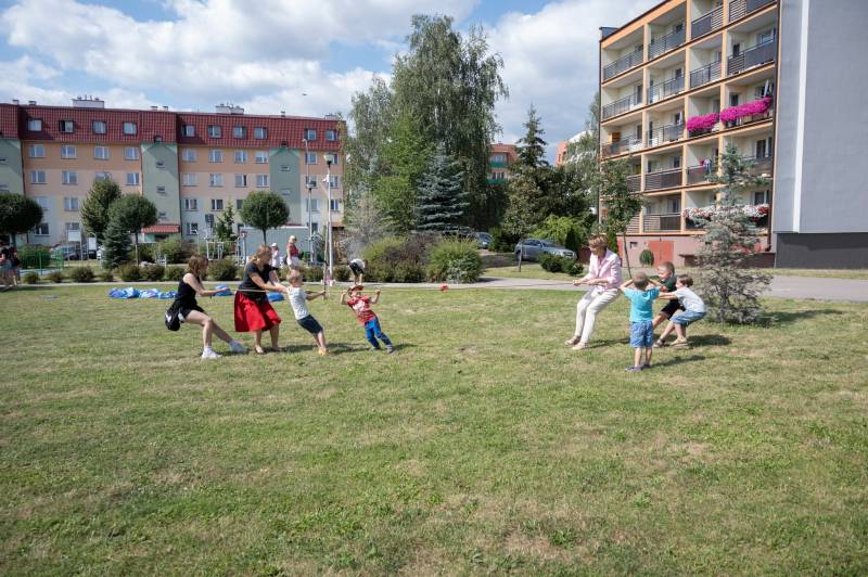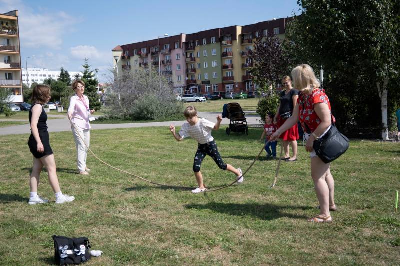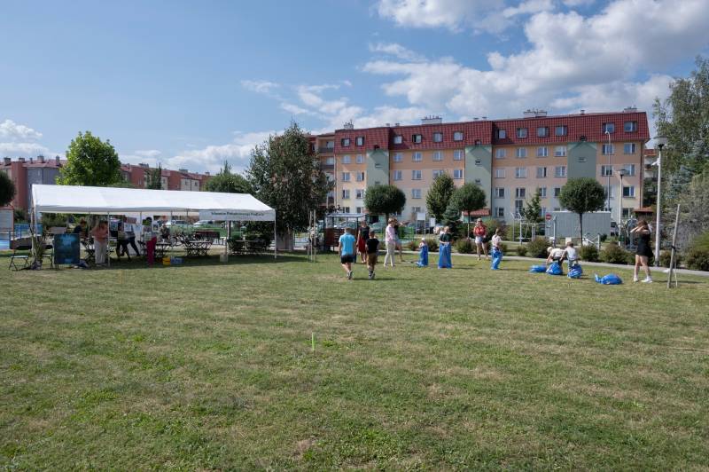 Zabawy naszych dziadków i pradziadków - ciuciubabka, uciekaj myszko, wyścigi w workach i przeciąganie liny sprawiły małym uczestnikom wiele radości podczas zabawy w parku wodnym przy ul. Terebelskiej