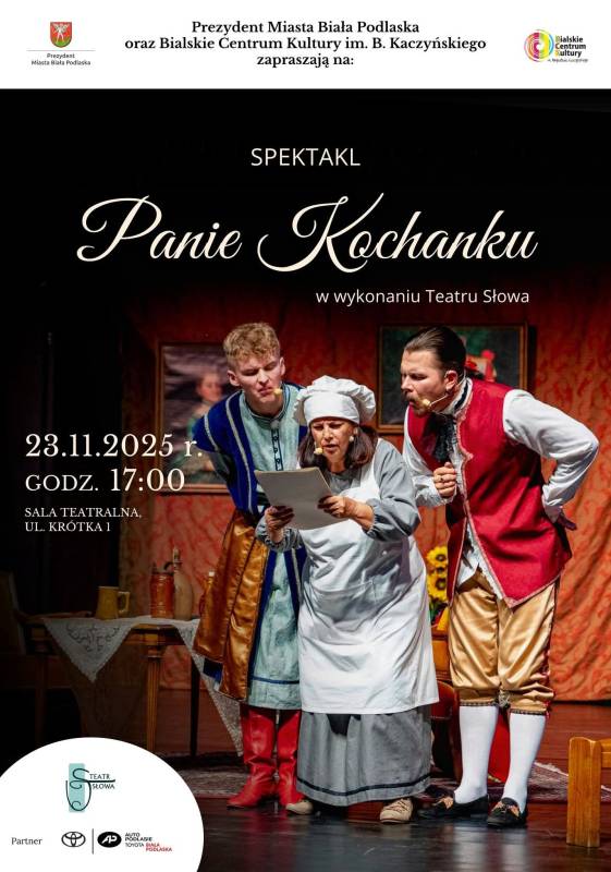 Spektakl "Panie Kochanku" w wykonaniu Teatru Słowa działającego przy Bialskim Centrum Kultury zostanie zaprezentowany 23 listopada o godzinie 17 w sali teatralnej Bialskiej Galerii Fotografii.