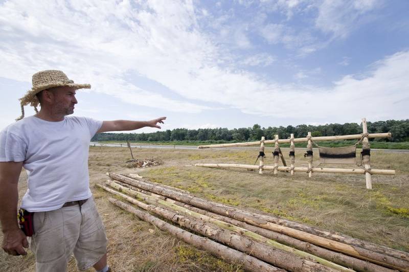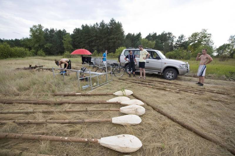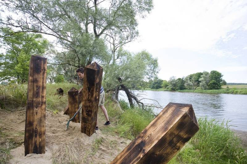 Monumentalnych rozmiarów będzie też instalacja Sławka Matyjaszewskiego. Lubelski rzeźbiarz swoje prace realizuje najczęściej w drewnie lipowym, z którym łączy inne materiały: sznur, płótno czy kamienie. Nie inaczej jest nad Bugiem, gdzie staną Pielgrzymy. Praca będzie złożona z pięciu obiektów, każdy wielkości 5,5 metra. Jej obecna lokalizacja to już trzecia, bo wcześniejsze położenie instalacji uniemożliwiało zbyt bliskie położenie od granicy, a także zajmowanie prywatnego terenu.