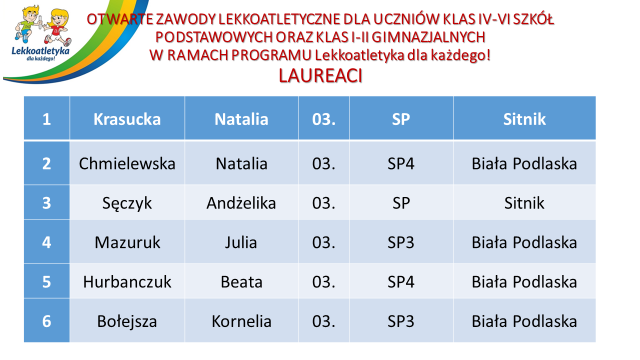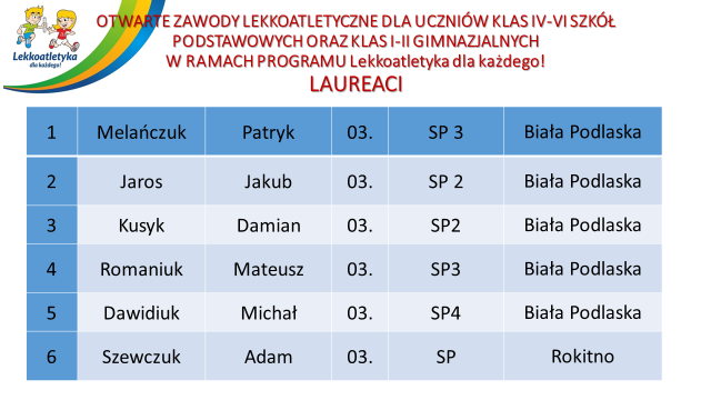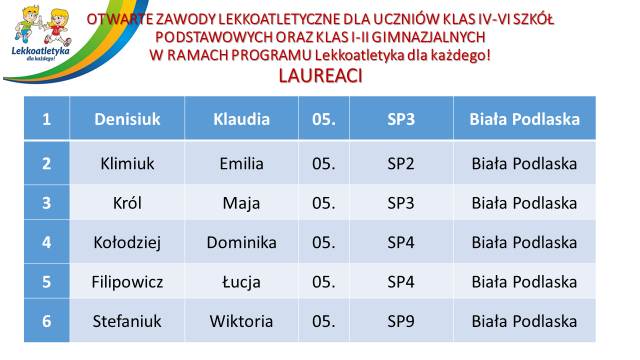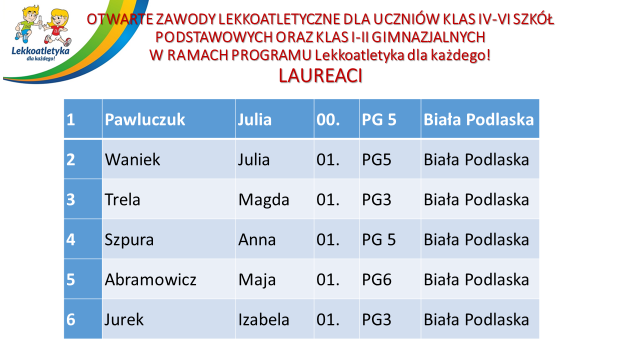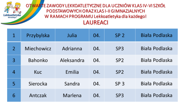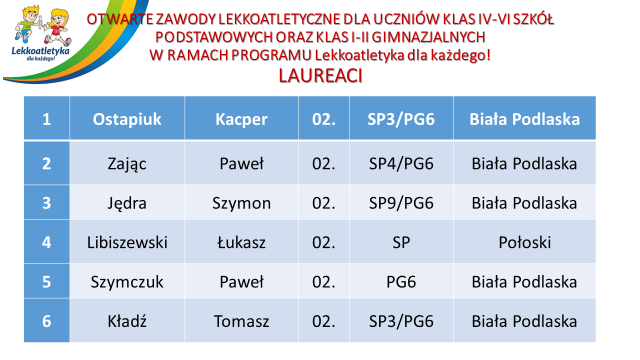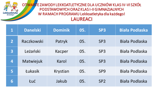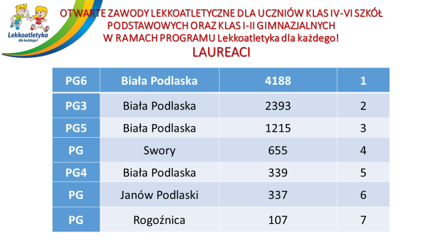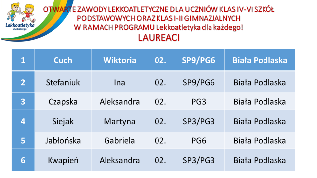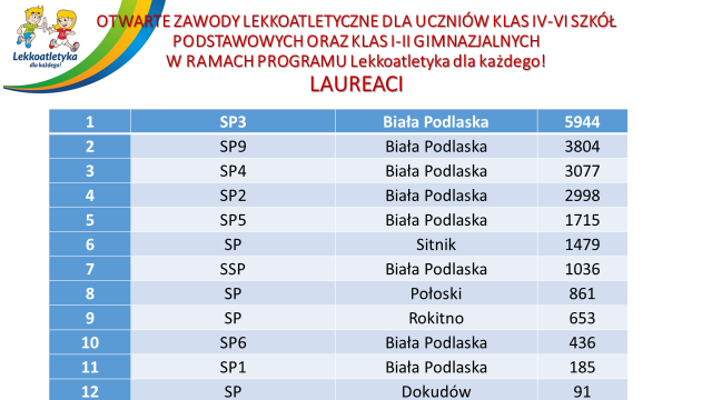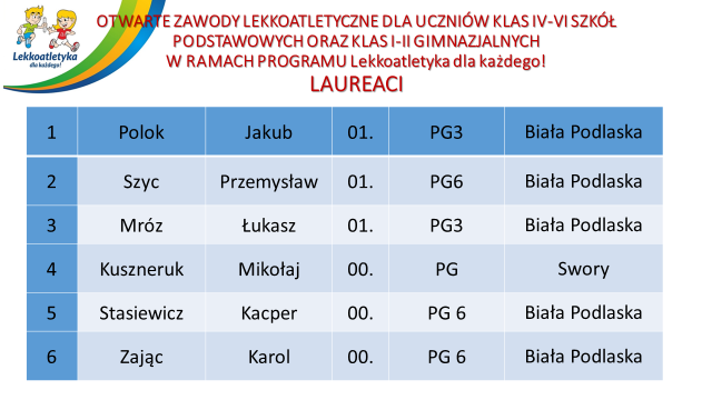 Podsumowano współzawodnictwo w ramach otwartych zawodów lekkoatletycznych dla dzieci z klasy IV-VI szkół podstawowych oraz I-II klasy gimnazjum. Zmagania odbyły się w ramach projektu „Lekkoatletyka dla każdego”.