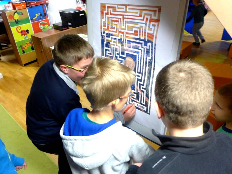 W programie znalazły się także głosowe zagadki o kolorach, ukryte w tajemniczych kodach QR. A na koniec naszego spotkania zaprosiliśmy wszystkich na zajęcia plastyczne pod hasłem „Udekoruj Artdinusia”. Było radośnie i twórczo, co można wywnioskować z powstałych wpisów na oknach, bo każdy otrzymał do rąk mazaki i mógł narysować bądź napisać o swoich wrażeniach z dnia sztuki w Multicentrum.