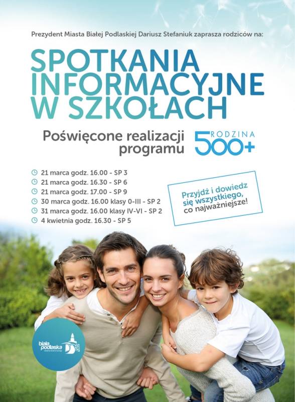 W bialskich szkołach odbyły się pierwsze spotkania w sprawie realizacji programu Rodzina 500+. Przedstawiciele urzędu miasta: Zofia Sebastianiuk oraz Łucja Samociuk, wraz z dyrektorami i rzecznikiem prasowym prezydenta, opowiadały o głównych założeniach projektu. Rodzice mogli też dostać wnioski do wypełnienia, niezbędne do otrzymania świadczenia na dziecko.