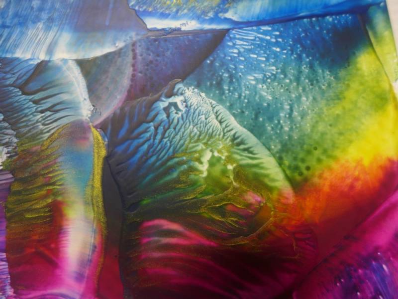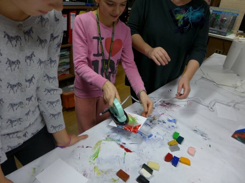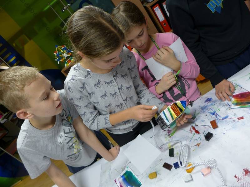 Spotkanie było także świetną okazją do eksperymentów z enkaustyką, czyli techniką malarską polegającą na malowaniu farbami woskowymi i żelazkiem. Dzięki warsztatom powstały przepiękne, kolorowe i radosne obrazy.