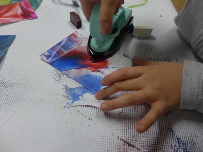 Spotkanie było także świetną okazją do eksperymentów z enkaustyką, czyli techniką malarską polegającą na malowaniu farbami woskowymi i żelazkiem. Dzięki warsztatom powstały przepiękne, kolorowe i radosne obrazy.