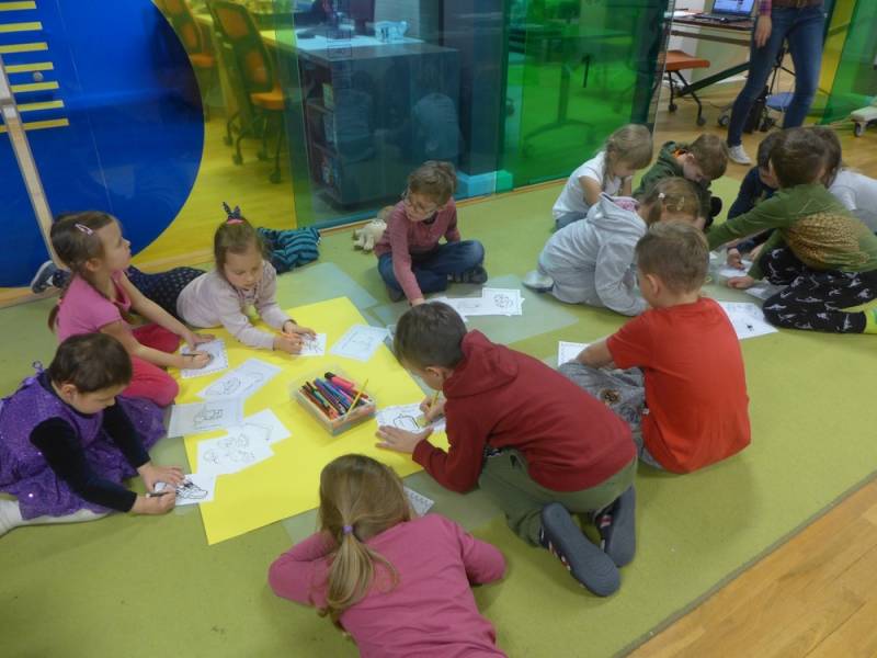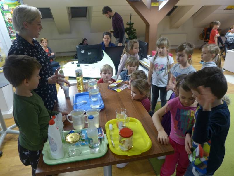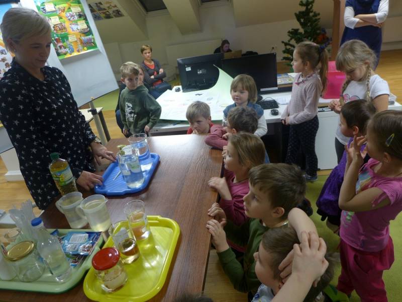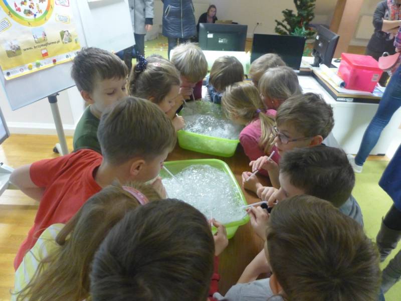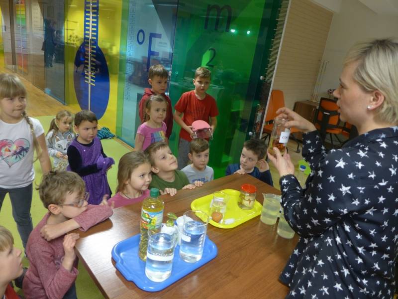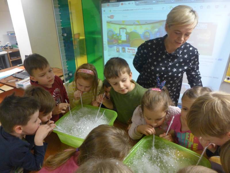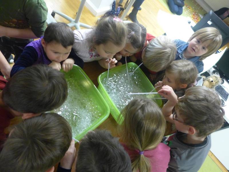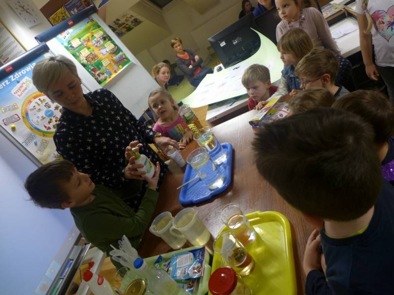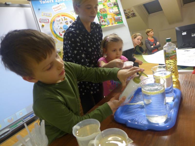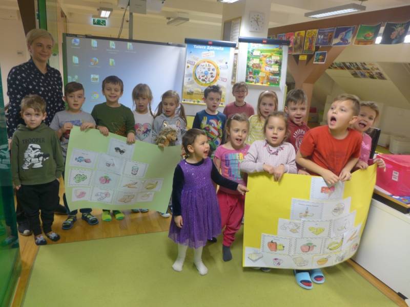 Gość poruszył temat zdrowego odżywiania oraz jego znaczenia dla naszego organizmu. Podsumowaniem zdobytej wiedzy było wykonanie przez dzieci piramidy żywienia. W kolejnej części zajęć zaprezentowano za to ciekawe eksperymenty, odpowiadające na pytanie co sprawia, że mydło myje, a proszek pierze.