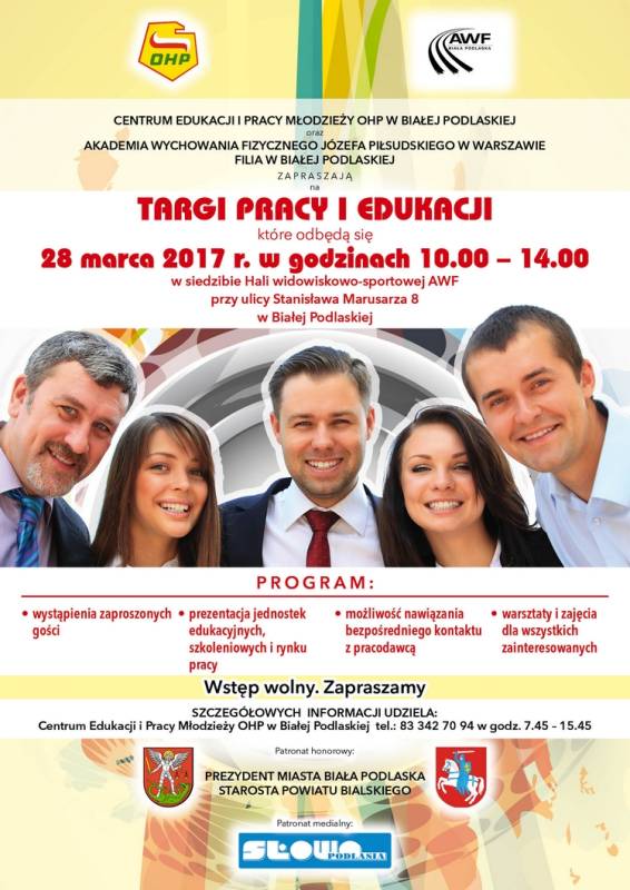 Centrum Edukacji i Pracy Młodzieży OHP w Białej Podlaskiej oraz Akademia Wychowania Fizycznego Józefa Piłsudskiego w Warszawie Filia w Białej Podlaskiej zapraszają na Targi Pracy i Edukacji, które odbędą się 28 marca w hali widowiskowo-sportowej AWF przy ul. Marusarza. Wydarzenie odbywa się pod honorowym patronatem prezydenta Dariusza Stefaniuka.