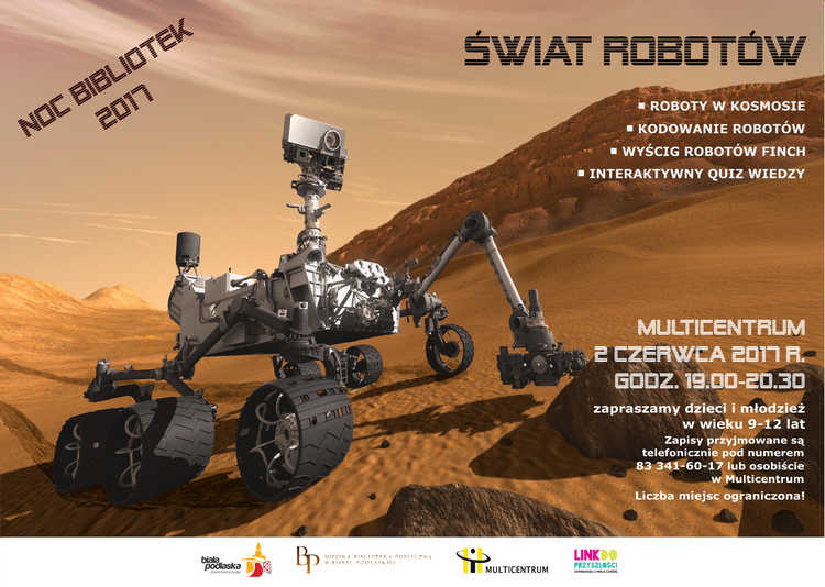 W związku z organizowaną w tym roku na początku czerwca Ogólnopolską Nocą Bibliotek, Multicentrum Miejskiej Biblioteki Publicznej zaprasza dzieci i młodzież w wieku 9-12 lat do udziału w wydarzeniu pt. „Świat Robotów”. Odbędzie się ono w piątek 2 czerwca (piątek) w godz. 19.00-20.30.