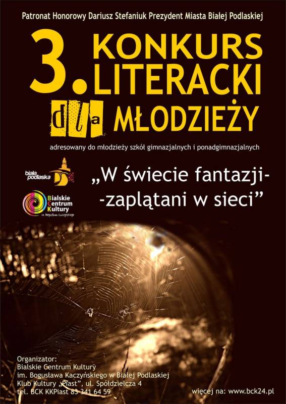 Zapraszamy młodzież szkolną do udziału w trzeciej edycji konkursu literackiego „W świecie fantazji” organizowanego przez klub kultury Piast Bialskiego Centrum Kultury. Tegoroczny temat - „Zaplątani w sieci”. Honorowy patronat nad konkursem objął prezydent Dariusz Stefaniuk.