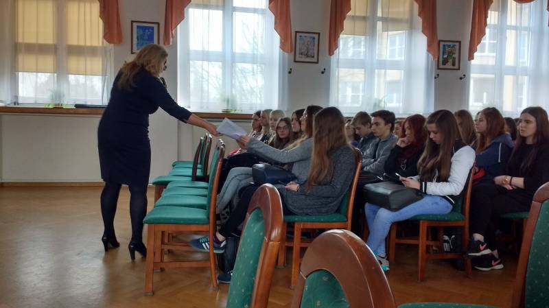 Podczas spotkania Jolanta Marczuk przedstawiła młodzieży zasady reklamacji rzeczy sprzedanych i usług na podstawie dotychczasowych i nowych przepisów konsumenckich oraz prawo do odstąpienia od umowy zawartej poza lokalem przedsiębiorstwa i na odległość.