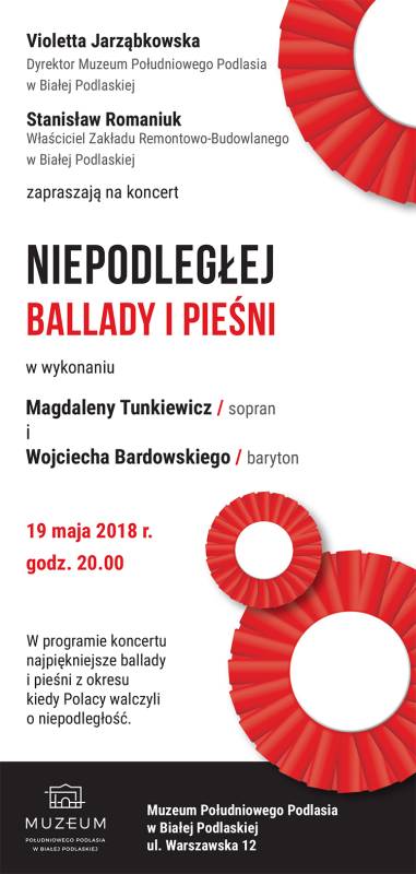 O godz. 20.00 odbędzie się koncert w wykonaniu Magdaleny Tunkiewicz (sopran) i Wojciecha Bardowskiego (baryton), znakomitych śpiewaków znanych z koncertów w parafii Wniebowzięcia NMP w Białej Podlaskiej.