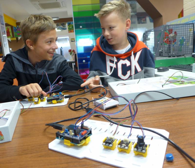 Drugie warsztaty, przygotowane z myślą o nieco starszych uczestnikach, pozwoliły im poznać nie tylko podstawy programowania, ale również elektroniki. Młodzież poznała między innymi takie elementy jak diody LED oraz różnego rodzaju czujniki, a następnie po właściwym podłączeniu do płytki Arduino odpowiednio programowała ich sposób działania.