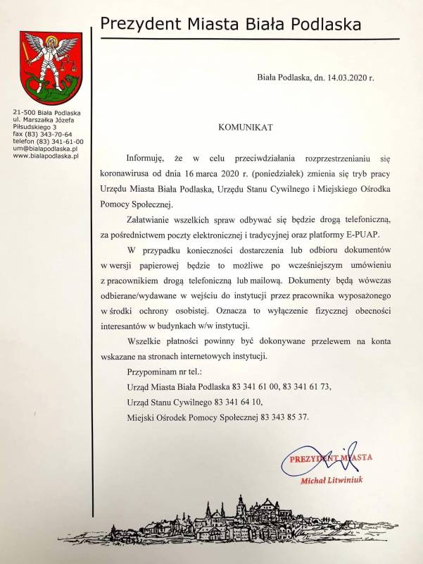 Prezydent Michał Litwiniuk zdecydował o zmianie trybu pracy Urzędu Miasta Biała Podlaska, Urzędu Stanu Cywilnego oraz Miejskiego Ośrodka Pomocy Społecznej. Zmiany obowiązują od 16 marca br. i mają na celu ograniczenie rozprzestrzeniania się koronawirusa.