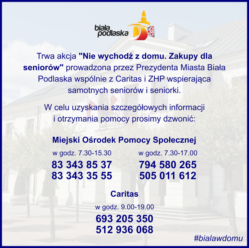 "Nie wychodź z domu. Zakupy dla seniorów" - w trudnym czasie, gdy najważniejsze jest ograniczenie ryzyka rozprzestrzeniania sięwirusa, Biała Podlaska uruchamia akcję wsparcia osób starszych. Temu służą działania Prezydenta Miasta Biała Podlaska Michała Litwiniuka prowadzone wspólnie z MOPSem, Caritasem i ZHP.