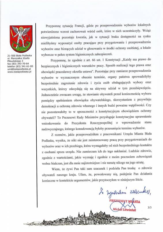 Ustawa Kodeks wyborczy zobowiązuje prezydentów, burmistrzów i wójtów do zorganizowania i przeprowadzenia wyborów. Jako prezydent miasta czuję odpowiedzialność za zdrowie mieszkańców Białej Podlaskiej. W kontekście powyższych argumentów przeprowadzenie wyborów 10 maja stanowi poważne zagrożenie nieuzasadnionego narażenia zdrowia i życia obywateli i za konieczne uważam przeniesienie ich na termin późniejszy. Bialczanie wprost informują mnie, że brak reakcji władz państwa na społeczne głosy sprzeciwu wobec udziału w wyborach rodzi ich poważny niepokój. Nie wolno tego lekceważyć.