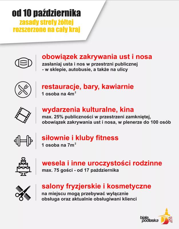 Zgodnie z nowym rozporządzeniem, od soboty obowiązują ograniczenia w organizacji imprez masowych i wydarzeń kulturalnych. Mogą być one organizowane pod warunkiem udostępnienia widzom lub słuchaczom co drugiego miejsca na widowni - z tym że nie więcej niż 25 proc. liczby miejsc, w przypadku braku wyznaczonych miejsc na widowni przy zachowaniu odległości 1,5 m pomiędzy widzami lub słuchaczami.