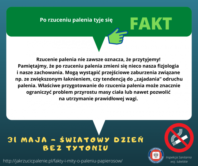 Dzień bez Tytoniu zachęca, aby spróbować rzucić palenie papierosów. Warto zacząć od małych kroków i odstawić palenie na 24 godziny. Rzucając palenie niczego się nie traci, można tylko zyskać. Nagrodą jest lepsza kondycja fizyczna, rzadsze infekcje dróg oddechowych, brak porannego kaszlu, poprawienie wyglądu cery. Najważniejsza jest motywacja. Trzeba uświadomić sobie, że chociaż nie jest to łatwa droga, możliwy jest sukces. Nie powinno zrażać się chwilowym niepowodzeniem, nie wolno rezygnować i poddawać się. Warto skorzystać z pomocy specjalistów.