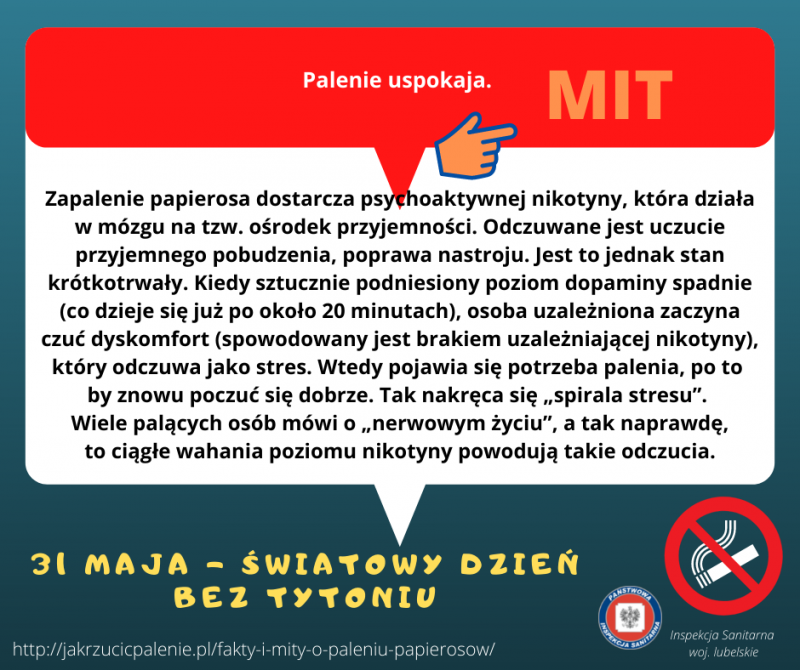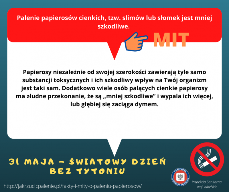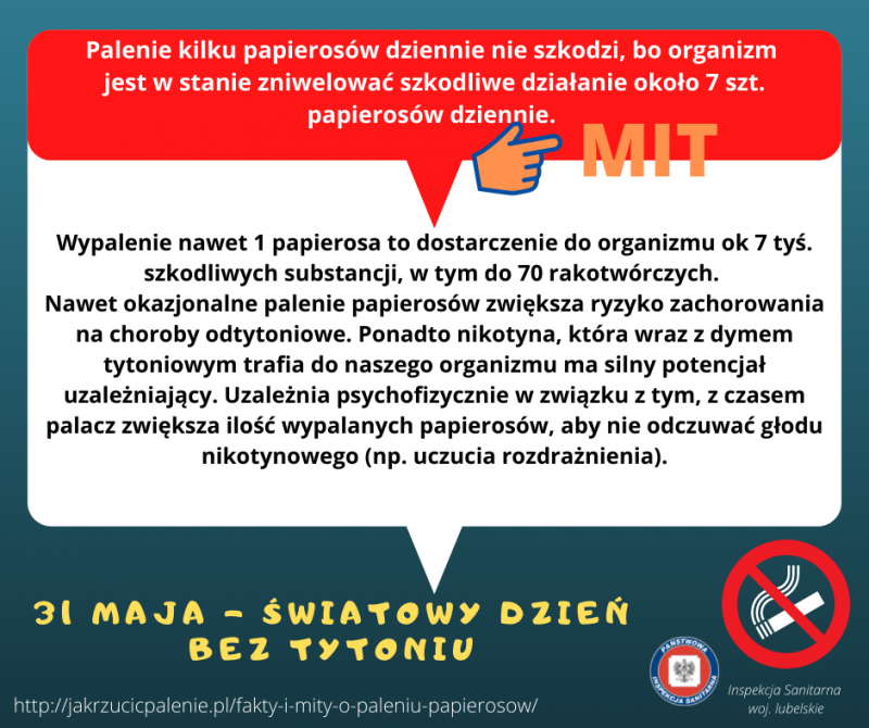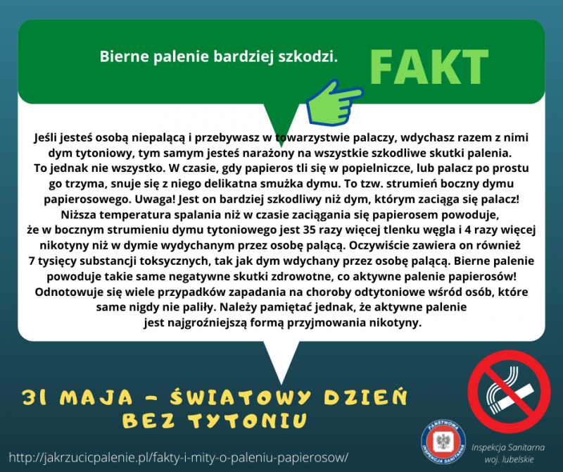 Każdego roku w dniu 31 maja obchodzony jest Światowy Dzień bez Tytoniu. Zainicjowane przez Światową Organizację Zdrowia w 1987 roku święto stanowi okazję do zwrócenia uwagi społeczeństwa na powszechność nałogu palenia papierosów i jego negatywnych skutków zdrowotnych. Wskazuje się jak ważna jest promocja zdrowego stylu życia bez palenia tytoniu, motywowanie do odpowiedzialnych wyborów związanych z własnym zdrowiem i zdrowiem bliskich osób, promocja alternatywnych sposobów spędzania wolnego czasu oraz kształtowanie postaw asertywnych szczególnie wśród młodych ludzi.