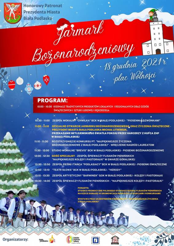 Jarmark Bożonarodzeniowy odbędzie się dnia 18 grudnia 2021 r. na placu Wolności w Białej Podlaskiej pod honorowym patronatem Prezydenta Miasta Biała Podlaska Michała Litwiniuka.
