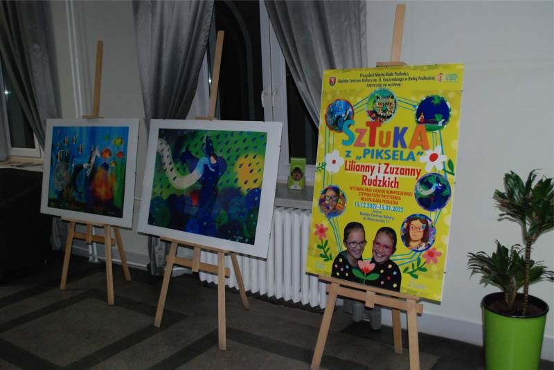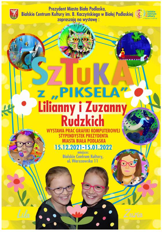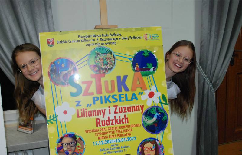 Z radością informujemy że Prezydent Miasta Biała Podlaska oraz Bialskie Centrum Kultury zapraszają do obejrzenia wystawy grafik komputerowych pt. „Sztuka z Piksela Liliany i Zuzanny Rudzkich". Siostry bliźniaczki, Lila i Zuzia w 2021 roku otrzymały od Prezydenta Miasta Biała Podlaska stypendium dla młodych twórców, zajmujących się działalnością artystyczną.