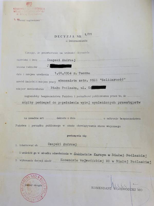 Pan Andrzej Czapski jako działacz Solidarności został internowany w nocy z 12/13 grudnia 1981 r. To właśnie doświadczeniami okresu stanu wojennego podzielił się z uczniami z klas humanistycznych (na początku z klasą III Ag, a następnie z klasą III A). Pan Andrzej Czapski także przekazał szkole kopie dokumentów związanych z internowaniem oraz okresem PRL.