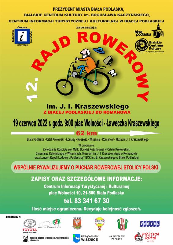 Serdecznie zapraszamy do udziału w 12. Rajdzie Rowerowy im. J. I. Kraszewskiego z Białej Podlaskiej do Romanowa, który odbędzie się 19 czerwca 2022 r. Spotykamy się przy Ławeczce J. I. Kraszewskiego na placu Wolności o godz. 9:00, skąd wyruszymy w 62 kilometrową podróż, włączając się we wspólne zmagania rywalizacji o Puchar Rowerowej Stolicy Polski.
