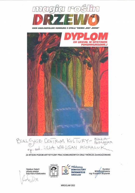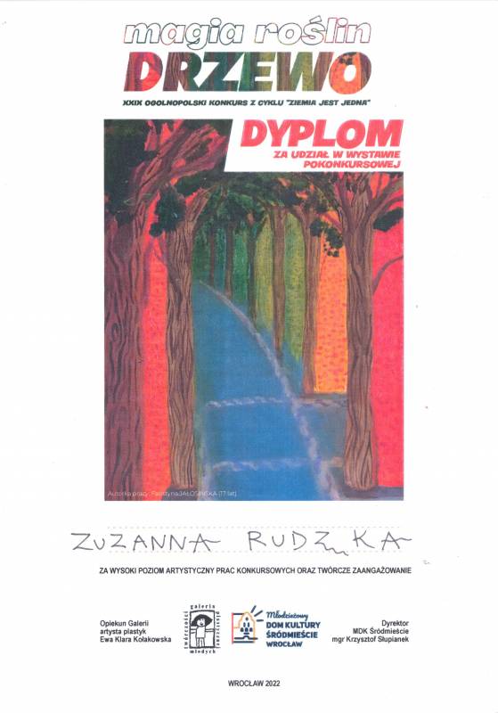 Śpieszymy poinformować o wynikach XXIX Ogólnopolskiego Konkursu Plastycznego z cyklu „Ziemia jest jedna" DRZEWO. Organizatorem konkursu jest działająca przy Młodzieżowym Domu Kultury Śródmieście we Wrocławiu Galeria Twórczości Plastycznej Młodych. Na konkurs nadesłano 779 prac z 81 szkół, placówek oświatowych i pracowni plastycznych z całej Polski.