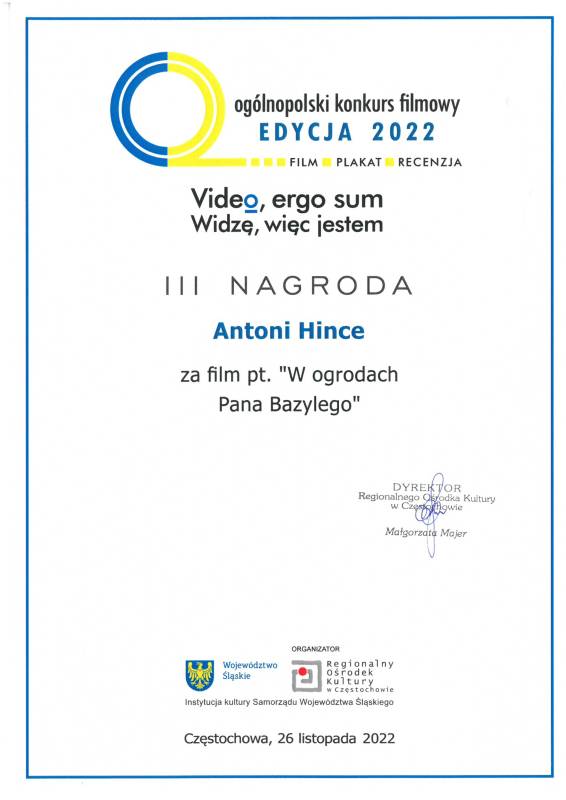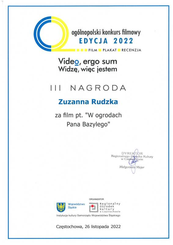 Miło nam poinformować że nasi młodzi artyści z Pracowni Grafiki Komputerowej „Piksel", prowadzonej przez panią Lillę Wielgan-Michaluk zostali uhonorowani kolejną nagrodą za film „W ogrodach Pana Bazylego" w Ogólnopolskim Konkursie Filmowym ,,Video, ergo sum - Widzę, więc jestem".