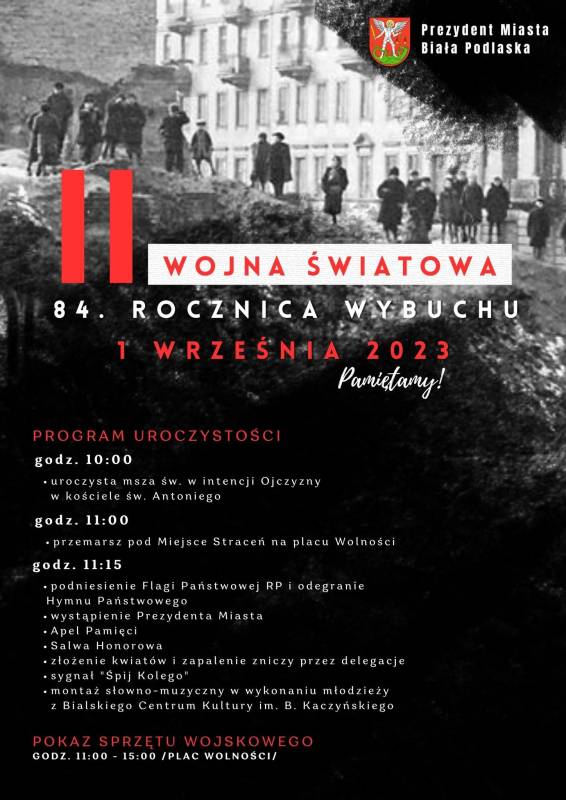 Prezydent miasta Michał Litwiniuk zaprasza na miejskie obchody 84. rocznicy wybuchu II wojny światowej. Uroczystości zainauguruje msza święta w intencji Ojczyzny w kościele św. Antoniego o godz. 10:00