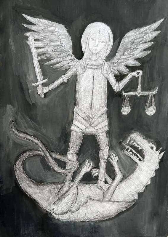 Przedstawia ona postać Michała Archanioła, stojącego na smoku, trzymającego w prawej ręce miecz uniesiony ostrzem do góry, w lewej zaś wagę. Smok leżący na plecach, skulony w odruchu obronnym, z otwartą paszczą, z ogonem owiniętym wokół prawej nogi świętego Michała. To wojownik walczący w imię sprawiedliwości i prawa. Przywoływany w walce przeciwko siłom zła, pomaga odnaleźć wewnętrzną siłę, daje wsparcie, cierpliwość, przynosi szczęście.