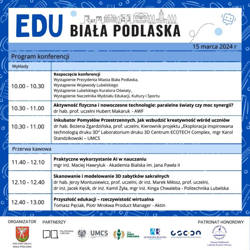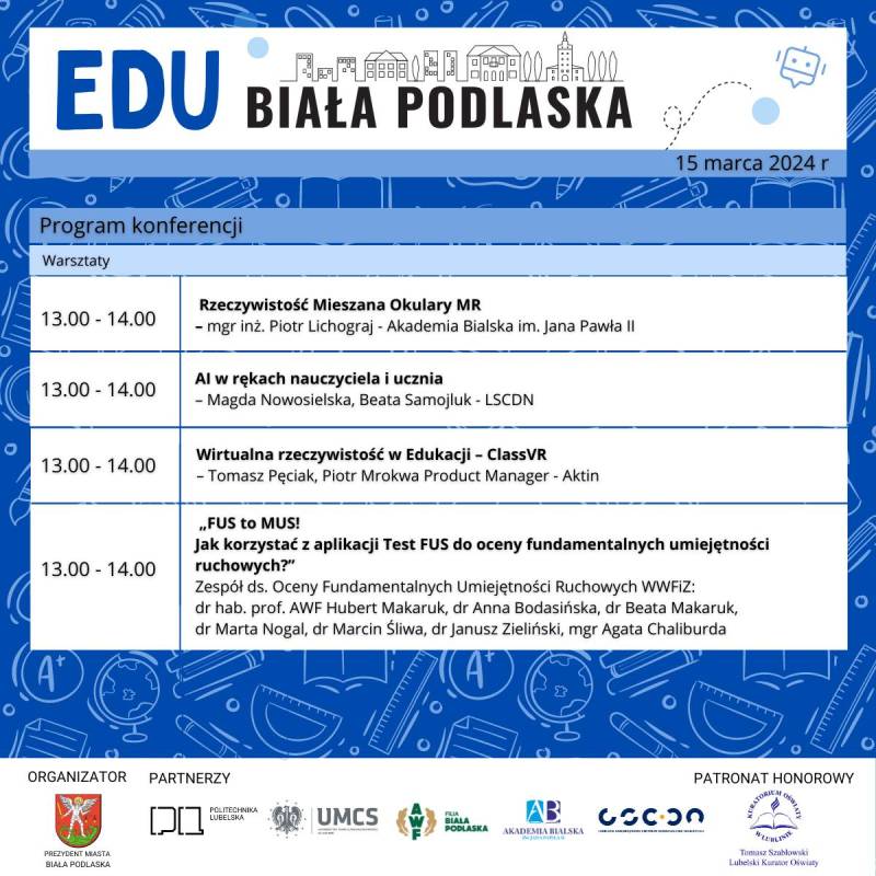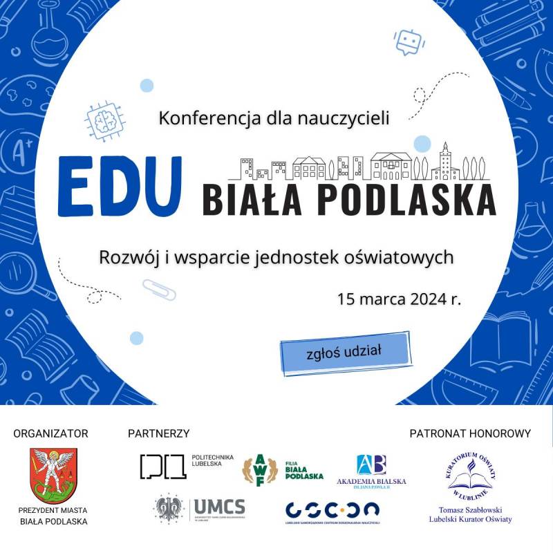 Prezydent Miasta Michał Litwiniuk serdecznie zaprasza dyrektorów szkół i nauczycieli na Konferencję Edu Biała Podlaska Rozwój i wsparcie jednostek oświatowych, która odbędzie się 15 marca 2024 r. w IV LO im. Stanisława Staszica.