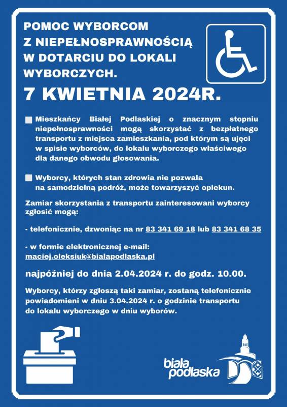 W dniu wyborów 7 kwietnia 2024 r. miasto pomoże wyborcom z niepełnosprawnością w dotarciu do lokali wyborczych.